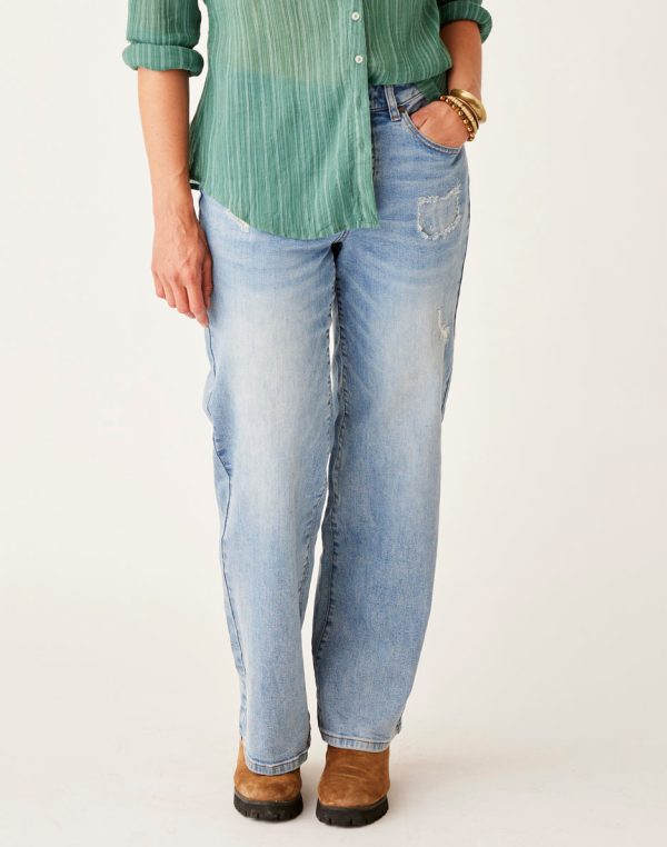 Our signature Victoria Twilight Stretch Denim, zipper fly with button closure and a longer length inseam provide backup to an otherwise showstopper. A high rise that is fitted at the waist and hip and relaxes into a slouchy straight leg. If you like the comfort denim feel of the Carson Jean but want more of a fitted waist and relaxed leg, the Audrey is your jean.