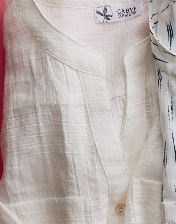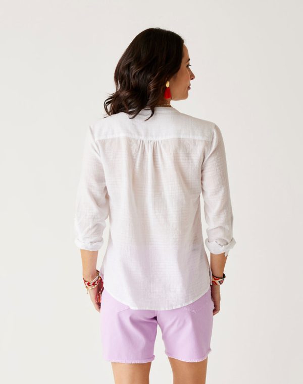 Simple sophistication make this lightweight summer top a weekend bag must. Chest pockets and three button open V-neck dial in the vibe in stride.