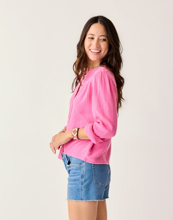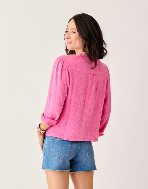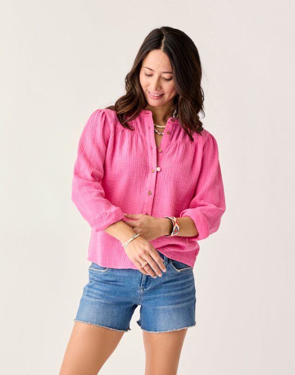 Lightweight as the regular Tatum Shirt, this Tatum doubles the gauze and the softness, thanks to its double gauze fabric. Gathered front yoke, volume sleeves and sleeve keyholes ring the bell, while doubling your pleasure.