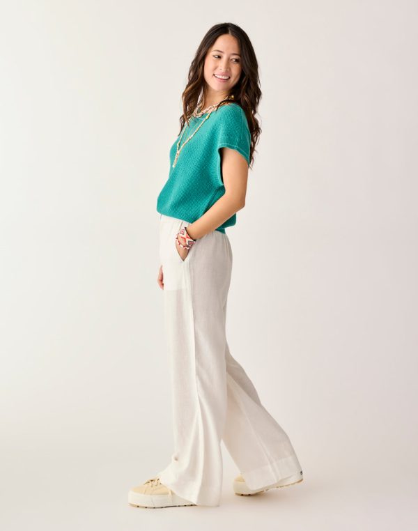 You don’t wear the Nico Linen Pant, you float them. Their relaxed fit, ultra-high rise with elastic waistband, and taping on side seam soothe the eye and inner soul. While side pockets provide a home for treasures and/or ballast to keep you from floating away…