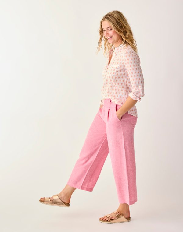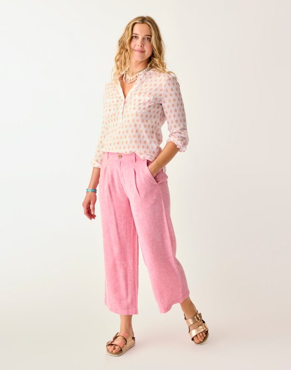 Like a summer breeze the Suki flows and goes where the spirit moves her. Embrace her front waist pleats, flat front waistband with elastic cord and raw hem. This pant is a thin linen, meant to be slightly see through to your swimsuit, radiating that beach to bar look we all strive for.