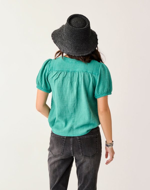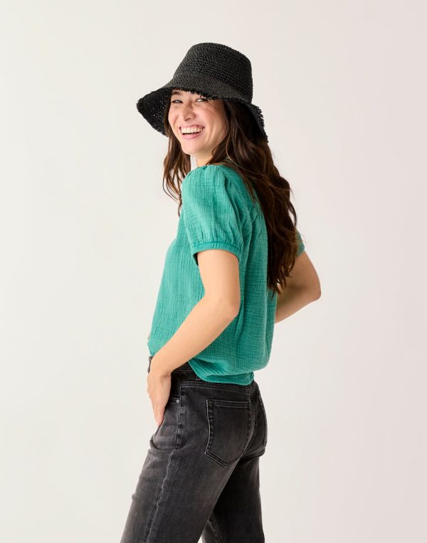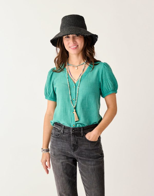 A warm weather winner, the 100% organic cotton Milo Gauze Top is an easy button up, with pleat detail on sleeve and elastic sleeve opening. Let it shine.