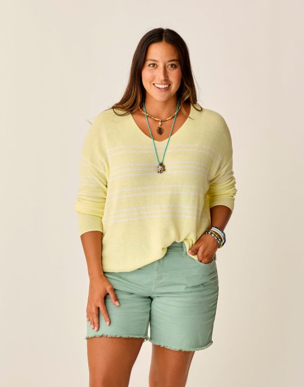 This lightweight 100% cotton sweater saunters into summer with cute, casual confidence. Her subtle back V-neck detail adds a little wink as you walk on by.