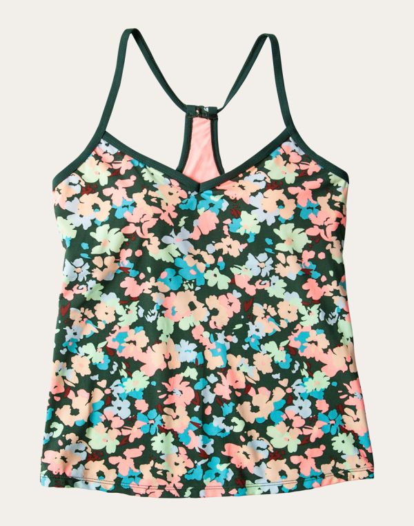 Based on our Stinson Bikini, the long torso of the tankini gives coverage where needed. We recommend this athletic t-back style for high levels of activity.