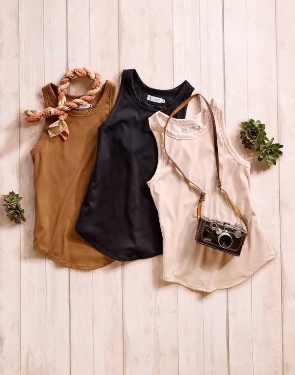 The Lyra is down for whatever adventures your day has to offer. She’s fitted, sports a high neck, 2×2 rib, racerback, and robust 50+ UPF.